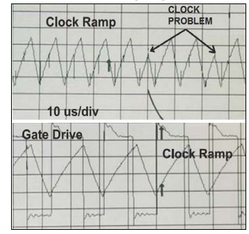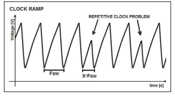 如果石英振蕩器有噪聲感應電壓在上升坡道上的尖峰,門檻將被越過早些時候,時鐘信號會比它早應該,如圖所示,這也將提前開始低坡道在圖中,這導致切換的突然變化PWM信號的頻率和高抖動,該時鐘斜坡非常容易受到PCB布局的影響芯片周圍的元件,因此,除非開關頻率在內部產生,易受影響蝕刻和元件會引入噪聲額外的抖動,這種行為可以避免,或者至少可以避免通過遵循適當的SMPS布局規則最小化.