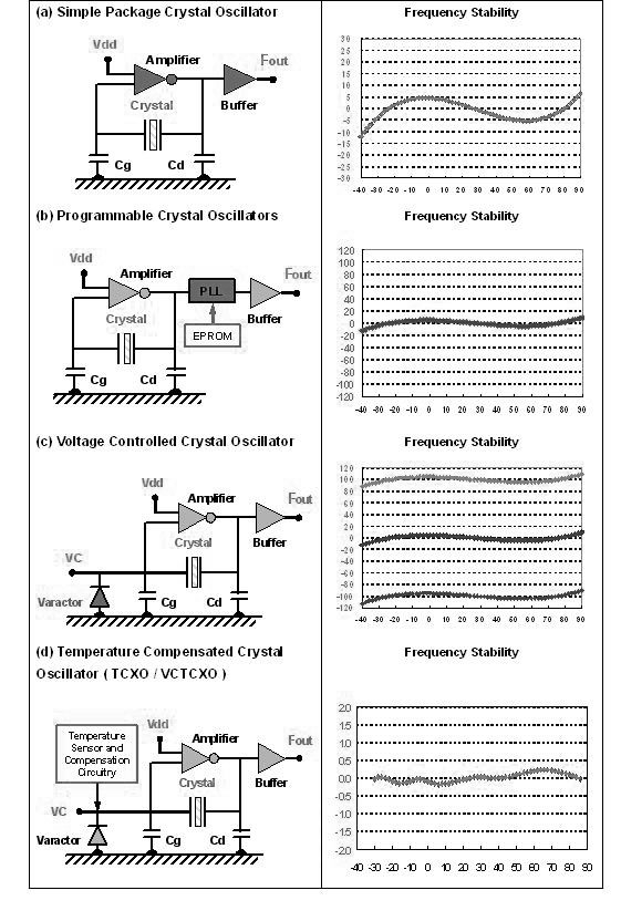 在(圖十二)提供了數種石英晶體振蕩器輸出頻率對溫度變化的穩定性示義圖