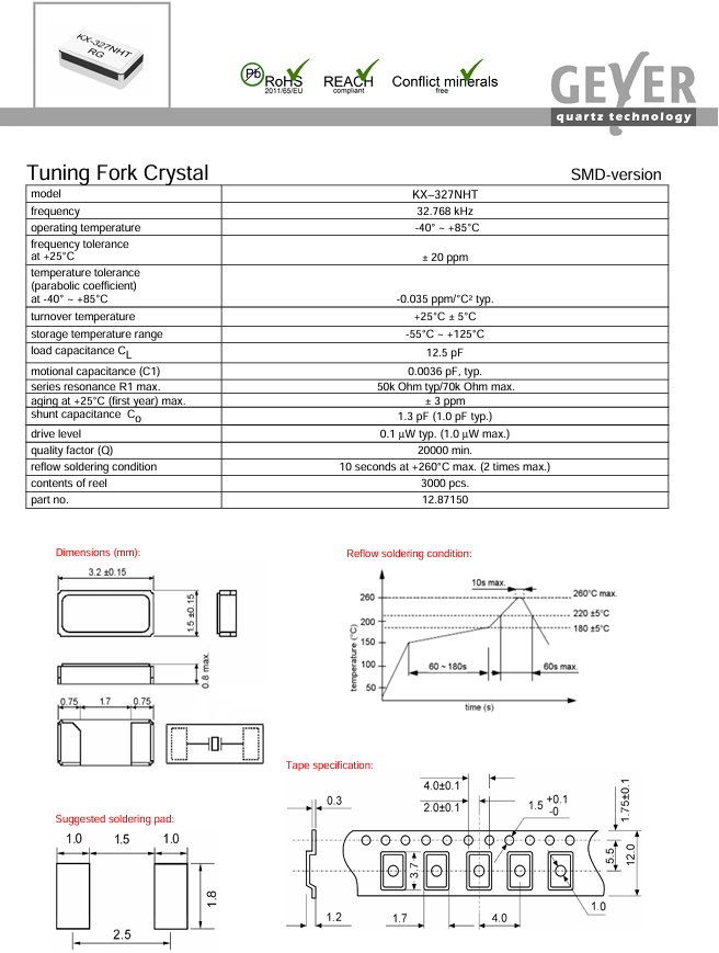 12.8716 | GEYER | CYSTAL 32.7680KHZ 12.5PF SMD | KX-327RT | ±20ppm | -40°C ~ 85°C | 4 | 2016 | Geyer |