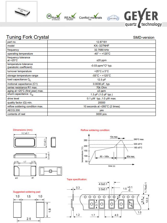 12.8718 | GEYER | Crystal 32.7680kHz 9pF SMD | KX-327NHF | ±20ppm | -40°C ~ 125°C | 2 | 3215 |