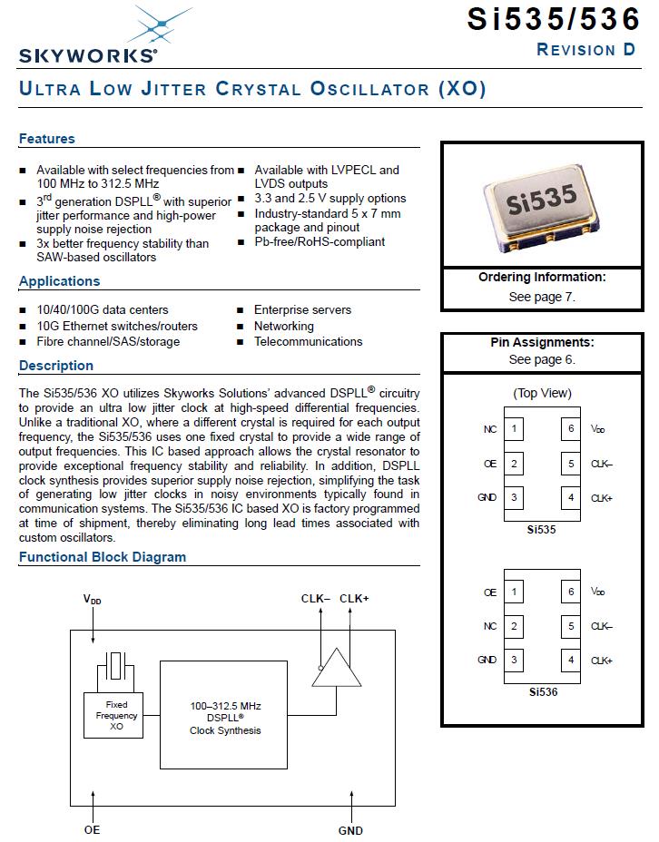 編碼536BB156M250DG,頻率為156.25MHz,Si535/536 XO時鐘振蕩器,OSC石英晶體振蕩器,采用Skyworks Solutions先進的DSPLL®電路在高速差分頻率下提供超低抖動時鐘。不像傳統的XO,每個輸出都需要不同的晶體頻率,Si535/536使用一個固定晶體提供廣泛的輸出頻率。這種基于集成電路的方法允許晶體諧振器提供卓越的頻率穩定性和可靠性。此外,DSPLL時鐘合成提供了優越的電源噪聲抑制,簡化了任務在嘈雜的環境中產生低抖動時鐘的方法通信系統。基于Si535/536 IC的XO是工廠編程的在發貨時,從而消除了較長的交貨時間定制的振蕩器。