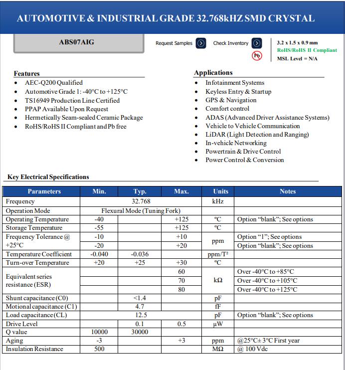 隨著行業的需求增長,艾博康公司推出編碼ABS07AIG-32.768KHZ-9-1-T無源晶振,符合AEC-Q200標準 汽車1級:-40°C至+125°C TS16949生產線認證 PPAP可應要求提供 氣密接縫密封陶瓷封裝 符合RoHS/RoHS II標準,無鉛.應用程序 信息娛樂系統 無鑰匙進入和啟動GPS和導航,舒適控制 ADAS(高級駕駛輔助系統),車輛對車輛通信,激光雷達(光探測和測距) 車載網絡,動力系統和驅動控制,電源控制和轉換.