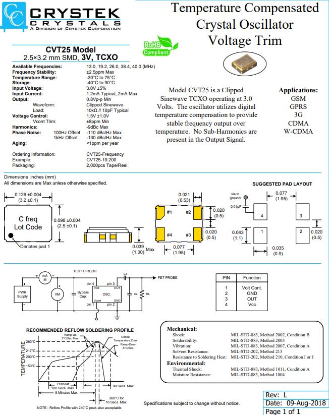 CVT25-19.200 | CRYSTEK振蕩器 | CVT25 | TCXO | 19.2MHz | ±2.5ppm | -30°C ~ 75°C |