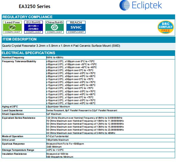 EA3250FA18-25.000M TR | Ecliptek石英晶體 | EA3250 | MHz 晶體 | 25 MHz | ±50ppm | ±30ppm | 18pF | CRYSTAL 25.0000MHZ 18PF SMD |