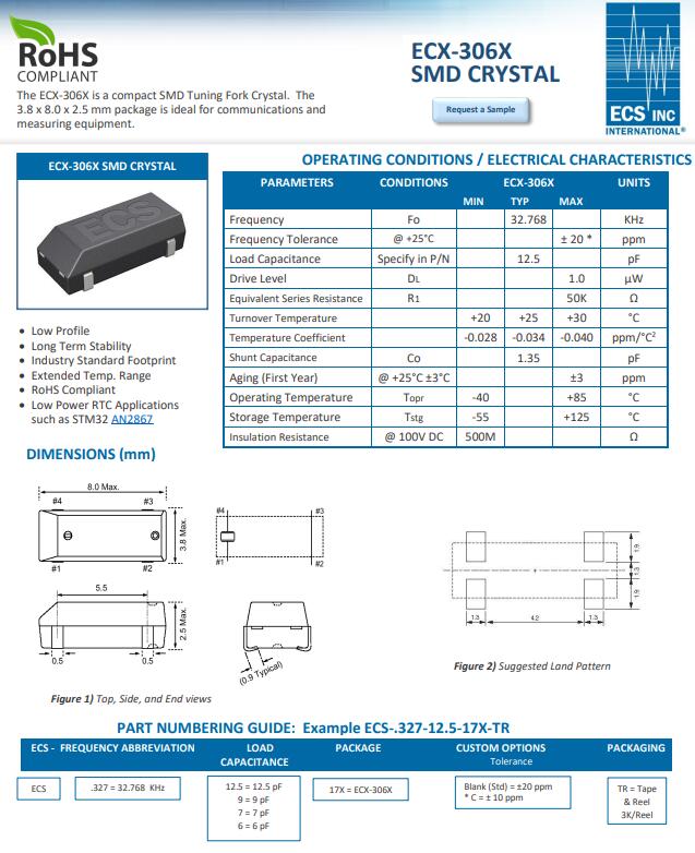 ECS-.327-12.5-34RR-TR | CRYSTAL 32.768KHZ 12.5PF SMD | ECX-34RR | kHz Crystal (Tuning Fork) | 32.768kHz | - | - | Surface Mount | 2-SMD, No Lead | 0.126" L x 0.059" W (3.20mm x 1.50mm) |