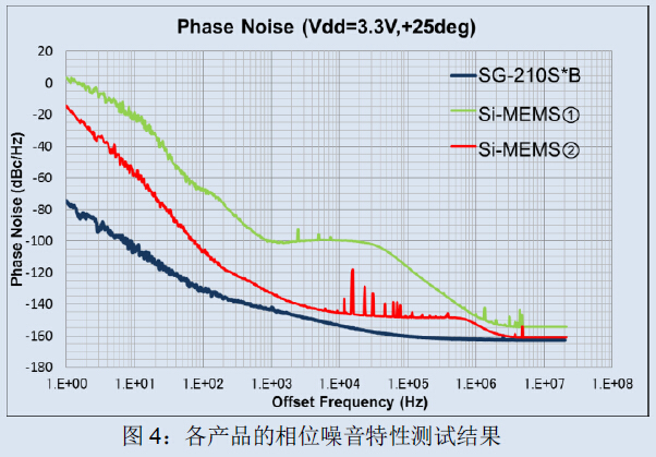 《圖4》表示3.3V電源電壓、+25℃條件下的石英晶體振蕩器與全硅MEMS振蕩器的相位噪音特性實測結果。