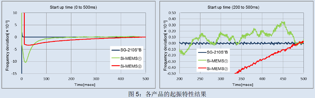 《圖5》表示以1毫秒為間隔的0至0.5秒時間段中,在3.3V電源電壓、+25℃的條件下各振蕩器通電后的起振特性。