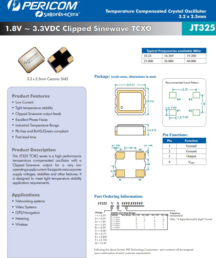 亞陶晶振JT325TCXO系列是一款高性能溫度補償振蕩器,具有削波正弦波輸出,可實現非常低的工作電源電流.它支持各種電源電壓、穩定性和其他功能.它旨在滿足嚴格的溫度穩定性應用要求.