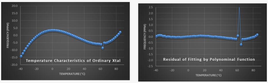圖4顯示了使用普通石英坯料的TCXO的溫度特性,在63°C時具有意外的頻率擾動.因此,如果工作溫度接近此臨界溫度點,則輸出頻率將發生突然跳躍.由這種不準確頻率驅動的系統至少會暫時出現惡化甚至故障.因此,Jauch溫補晶振只使用高質量的石英坯料和復雜的晶體設計,以避免我們的TCXO出現任何類型的頻率擾動.