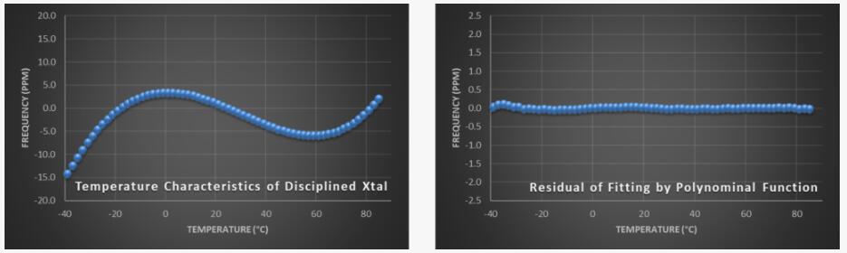 普通石英坯料可能存在輕微的缺陷或雜質,例如石英表面的拋光區域不足或晶坯中的晶格無序.這些微小的不規則性可能會導致特定溫度范圍內的快速頻率跳躍,這不能用有限次多項式方程來描述.因此,TCXO溫補晶振的補償機制在這個特定的溫度范圍內將是不準確的.這種現象稱為“頻率擾動”,在下面的圖4中進行了可視化.