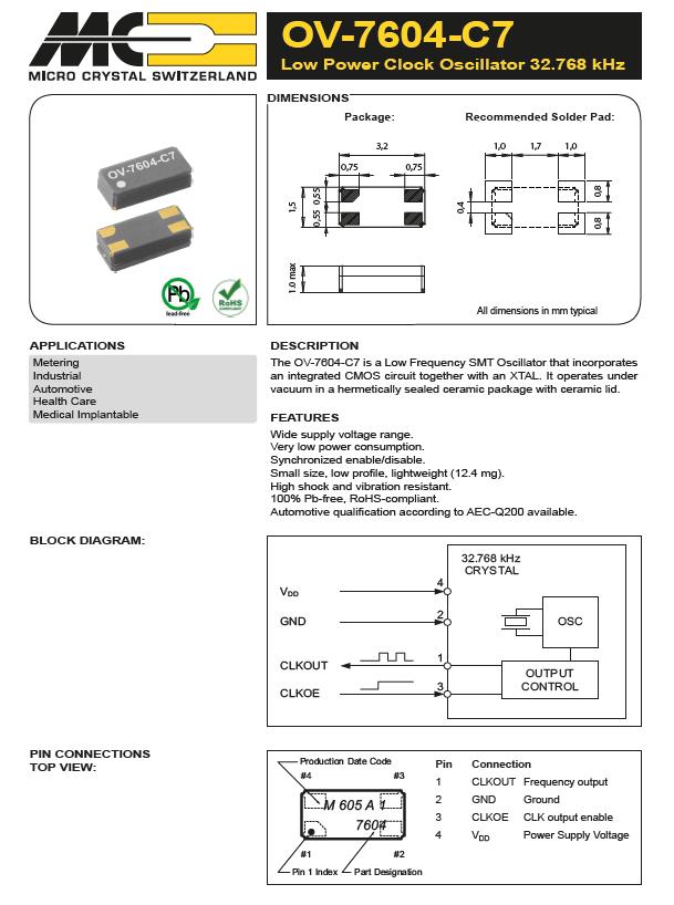 OV-7604-C7-32.768kHz-20PPM-TB-QC | Micro晶振 | 標準時鐘振蕩器 32.768 kHz +/-20 PPM -40/+125C |