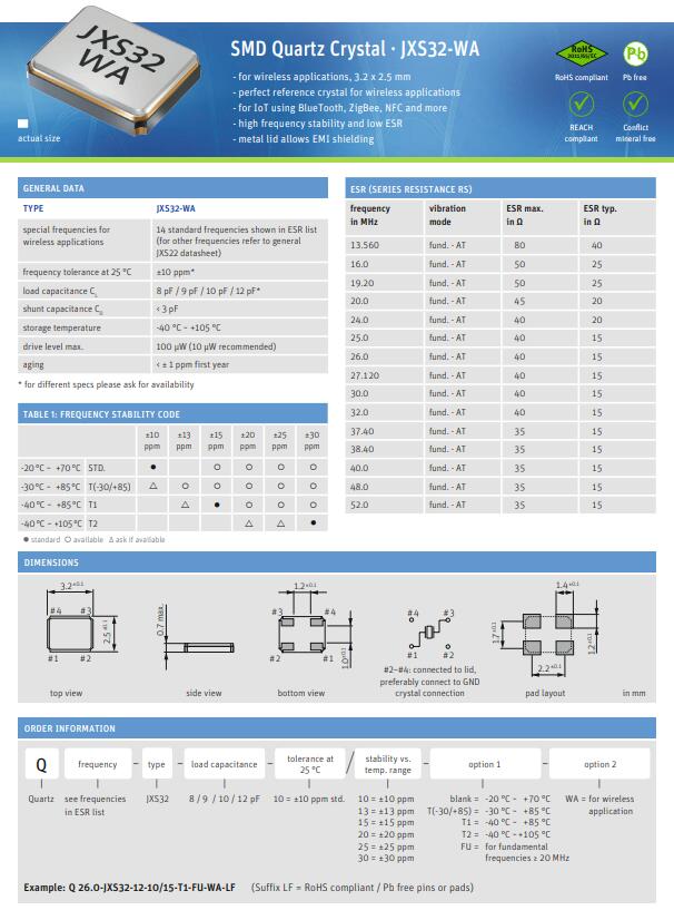 Q 20.0-JXS32-9-10/10-FU-WA-LF | Jauch Quartz | 20MHz | ±10ppm | 9pF | -20°C ~ 70°C | 4 | 3225 |