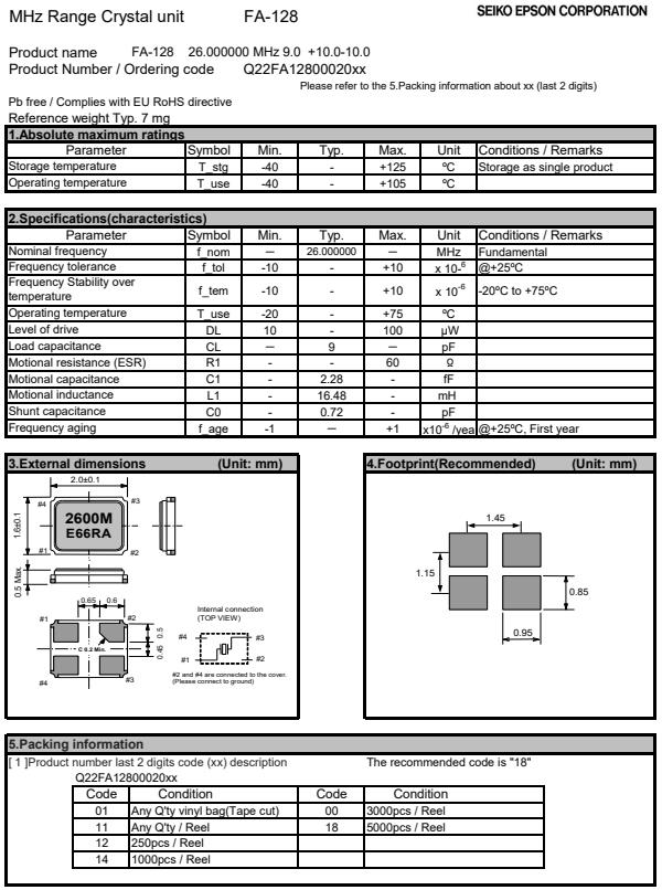 Q22FA1280002400 | 2 x 1.6 x 0.5mm | FA-128 | 26.000000 MHz | 12 pF | +/-10 ppm |