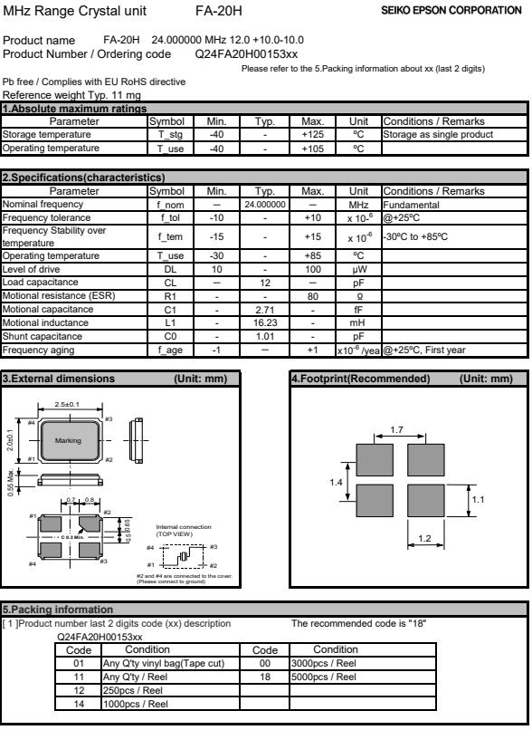 Q24FA20H0015600 | 2.5 x 2 x 0.55mm | FA-20H | 24.000000 MHz | 7 pF | +/-10 ppm | -20 to +75 °C |