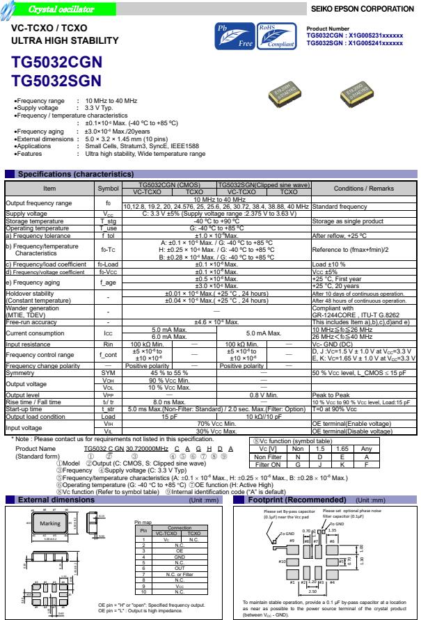 X1G005241001400 | TG5032SGN | 10.000000 MHz | 5.00 x 3.20 x 1.45 mm | 3.135 to 3.465 V | +/-1.0 ppm | -40 to ++85 °C | +/-0.10 ppm |