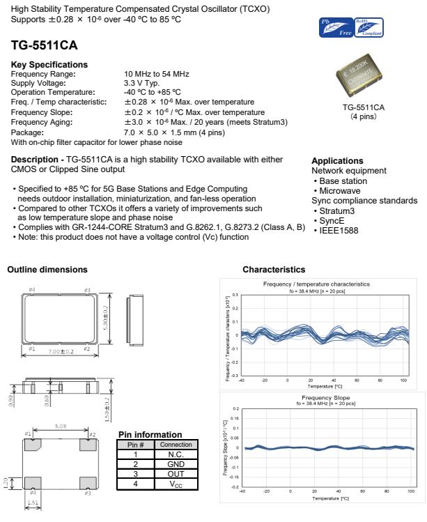 適合5G室外基站專用的TCXO溫補晶振X1G006011004314,愛普生公司推出了TG-5511CA晶振,溫補晶振編碼X1G006011004314,頻率20.000000兆赫,輸出WaveCMOS,電源電壓3.13 ~ 3.46 V,電源電壓(一般)3.300 V,尺寸(LxWxH)7.0 x 5.0 x 1.5 mm,工作溫度-40至+105°C,頻率公差+/- 1.0 ppm,5G基站和邊緣計算可調至+85℃,需要戶外安裝,小型化和無風扇操作,與其他tcxo相比,它提供了各種改進,如由于低溫的坡度和相位噪聲,符合GR-1244-CORE Stratum3和G.8262.1, G.8273.2 (A類,B類),注意:本產品沒有電壓控制(Vc)功能.