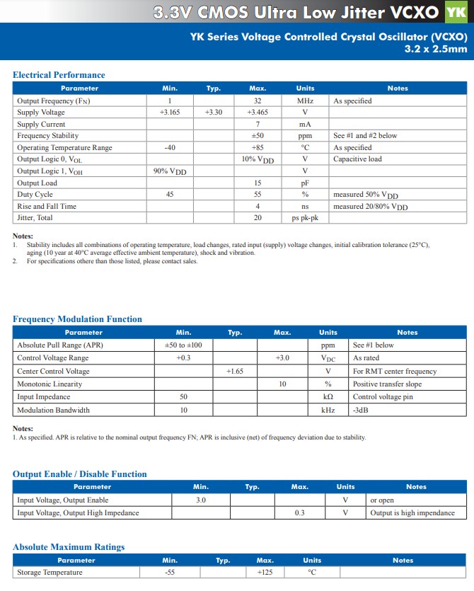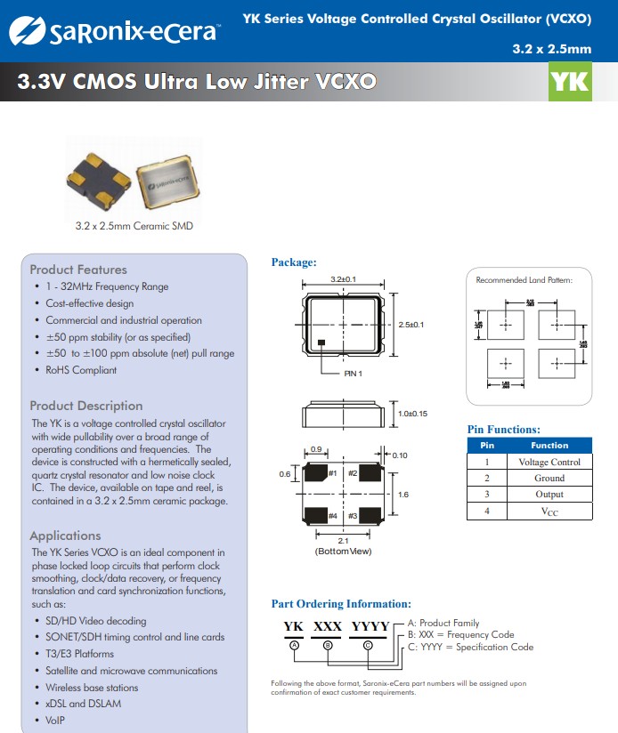 YK 3.3V | None | CMOS | 1 至 66 | <2 ps RMS | 3.2 x 2.5 x 1.0 | 4 |