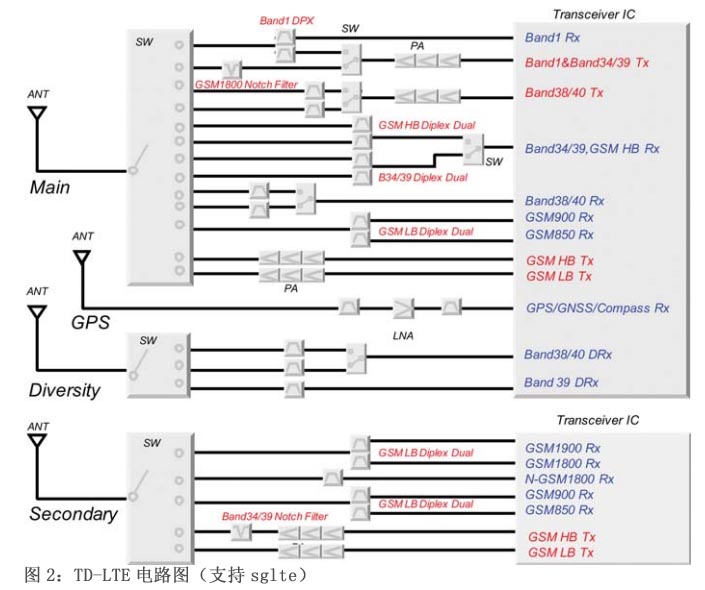 圖2說明了一個電路TD-LTE(sglte).目前終端支持TD-LTE當然需要進行雙重模式或三模式支持GSM或UMTS以提供語音通信.對于GSM,四條帶,850MHz 900MHz 1800MHz和1900MHz,,,,一般為國際漫游的支持,和一個過濾器是將每個波段的接收端上.UMTS,因為它的帶1雙工(FDD,天線共享器)是必需的.