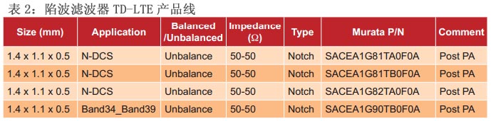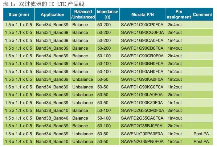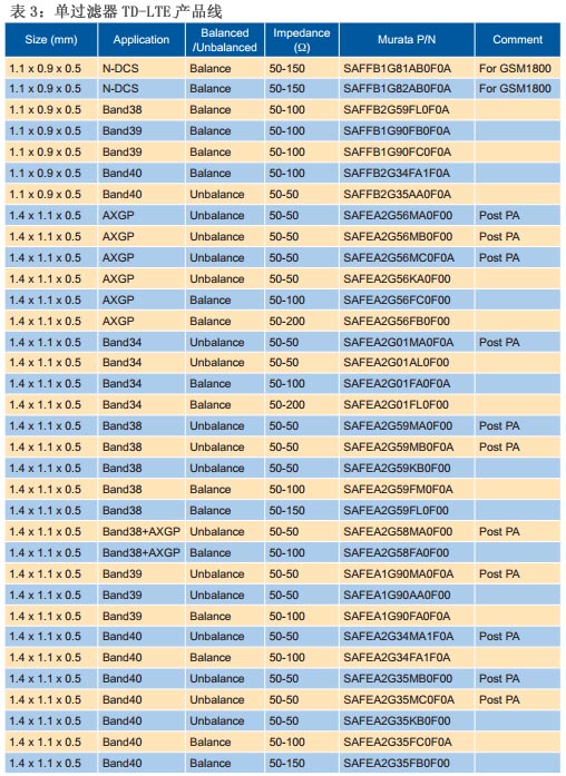1至3顯示的表面聲波(SAW)的產品線表TD-LTE,村田制作所發布了到目前為止濾波器.雙濾波器列于表1,表2和表3中的陷波濾波器,單濾波器.